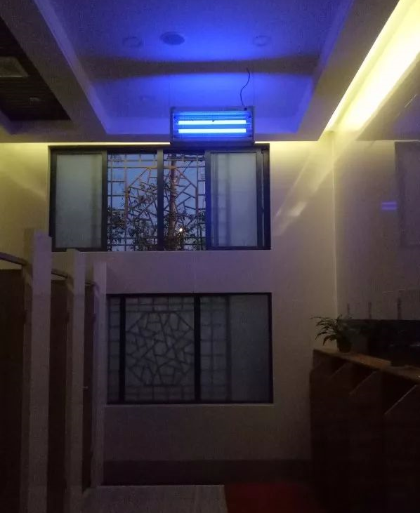 在傍晚的灯光的映照下,正面前有一排竹子,有风吹过,发出轻微的婆娑声。(厕所外墙)(正面的一排竹子)(洗手台)进门正中,设计有坐椅,摆放两盆绿植,顶上光线柔和,显得安静又温暖。